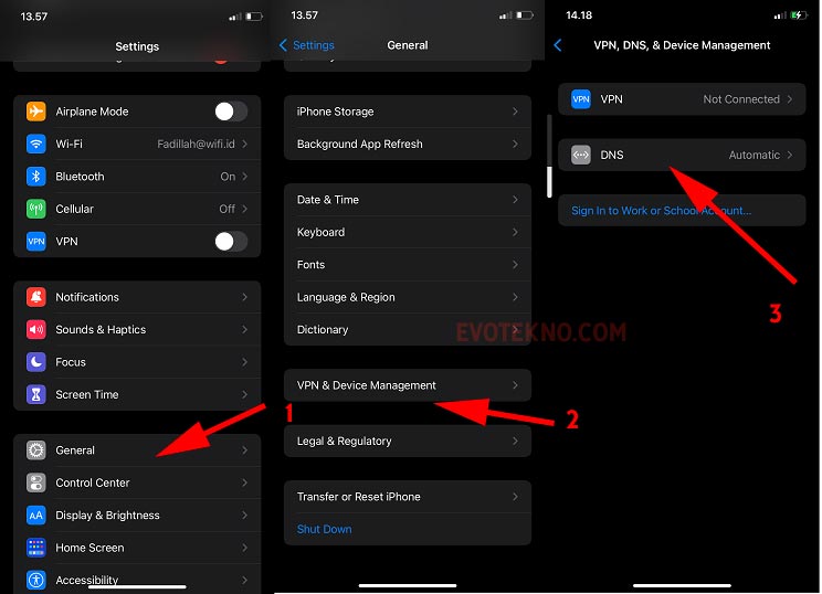 - Belum sepenuhnya aktif, nah untuk mengaktifkan masuk ke Pengaturan > General > VPN & Device Management > DNS