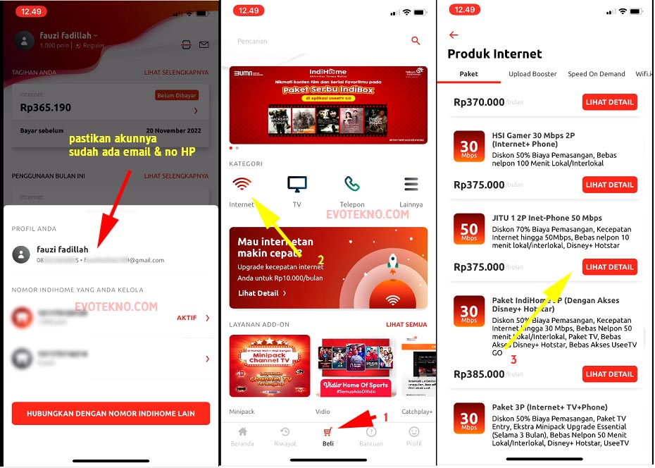 - Download Aplikasi MyIndiHome: Android / iOS, kemudian login dengan akun yang sudah Anda persiapkan.