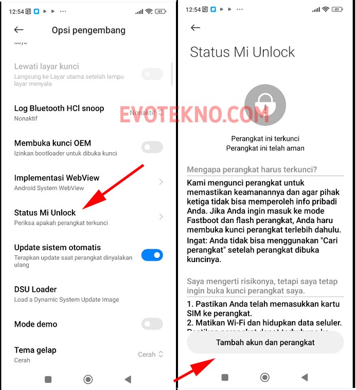 3. Selanjutnya pada opsi pengembang, buka ‘Mi Unlock Status“, nah untuk request UBL klik “Tambahkan akun dan perangkat