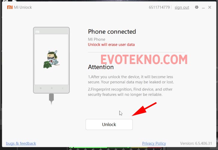 4. Bilamana sudah terdeteksi, terakhir klik “UnlockMulai Unlock Bootloader Xiaomi - Mi Unlock
