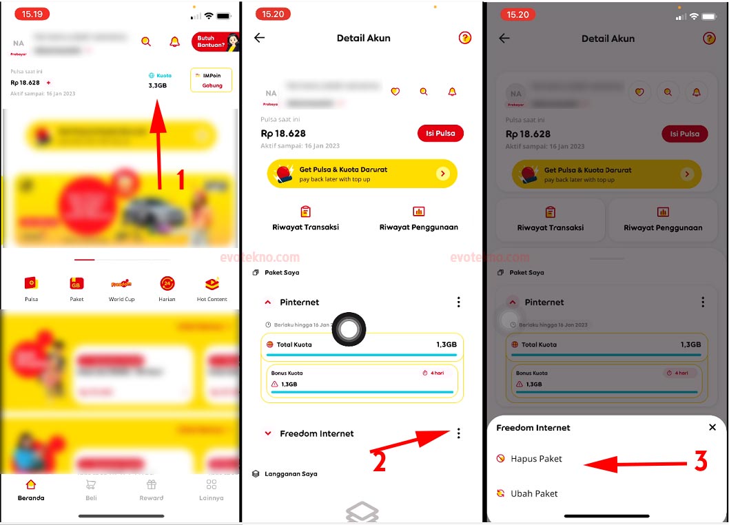 - Terakhir klik icon elipsis (⋮) tugas Anda pilih paket yang akan akan dihentikan dengan mengklik “Hapus Paket“