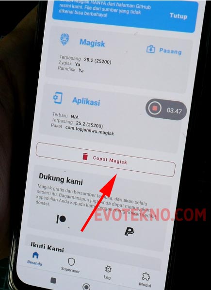 Tutorial kali ini sebenernya tak perlu Anda lihat, karna tombol untuk unroot terpampang dihalaman utama Magisk.