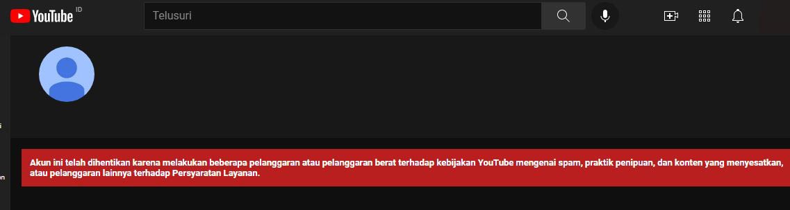 Akun ini telah dihentikan karena melakukan beberapa pelanggaran atau pelanggaran berat terhadap YouTube mengenai spam, praktik penipuan dan konten yang menyesatkan, atau pelanggaran lainnya terhadap Persyaratan Layanan