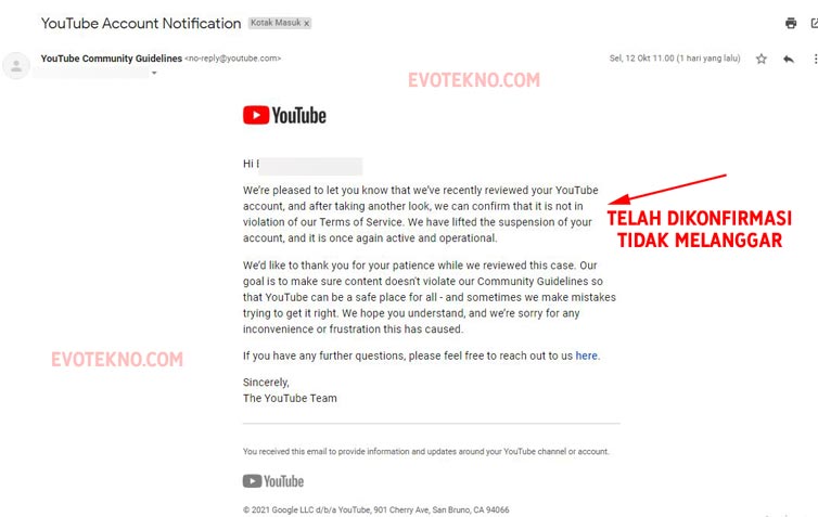 Tanggal 11 Oktober 2021, pukul 11:00 WIB, syukurnya ada balasan yang menyatakan YouTube telah mengulas channel saya dan hasilnya channel saya dikonfirmasi tidak melakukan pelanggaran.