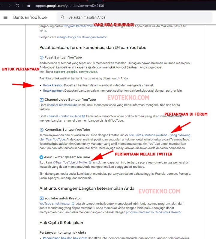 • Mendapatkan bantuan sebagai Kreator YouTube: Selain melalui e-mail dan chat, Anda bisa bertanya di Twitter resmi @TeamYouTube dan juga forum Komunitas Bantuan YouTube.Kontak yang dapat dihubungi untuk YouTube