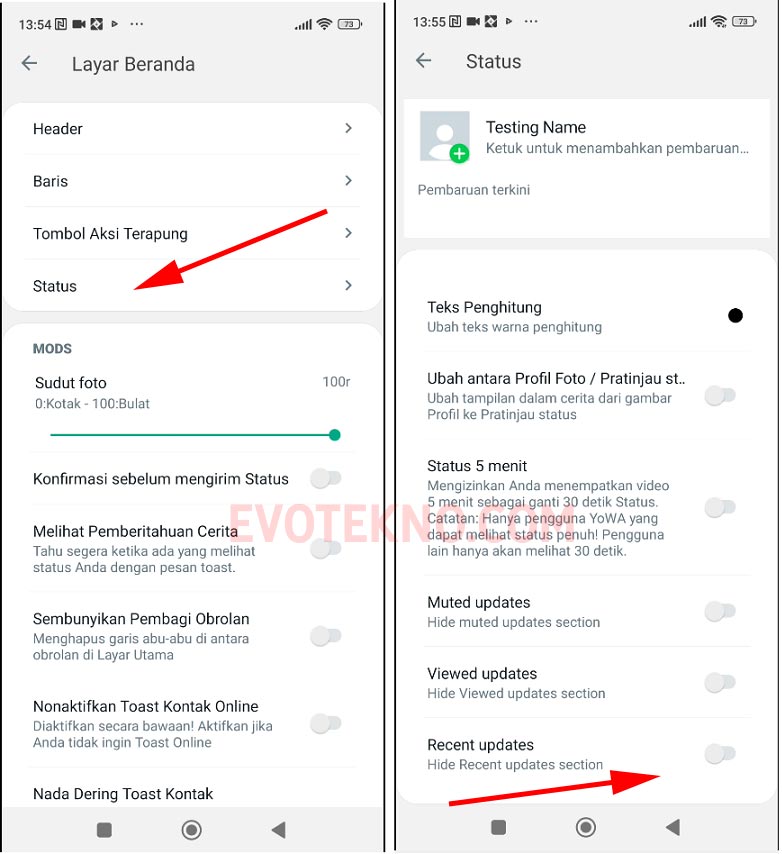 - Kemudian masuk ke pengaturan “Status” Nah sekarang scroll ke bawah dan pastikan pada “Recent updates” pastikan sudah dalam keadaan non-aktif