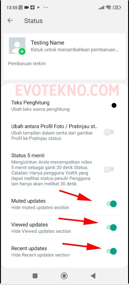 Nah, sesuai pertanyaan, Anda sudah ikuti tutorial di atas; jujur saya juga mengalami hal ini, pengaturan “Recent update” sudah non-aktif tapi beberapa kali bikin status di nomor lain, tetep gak muncul.